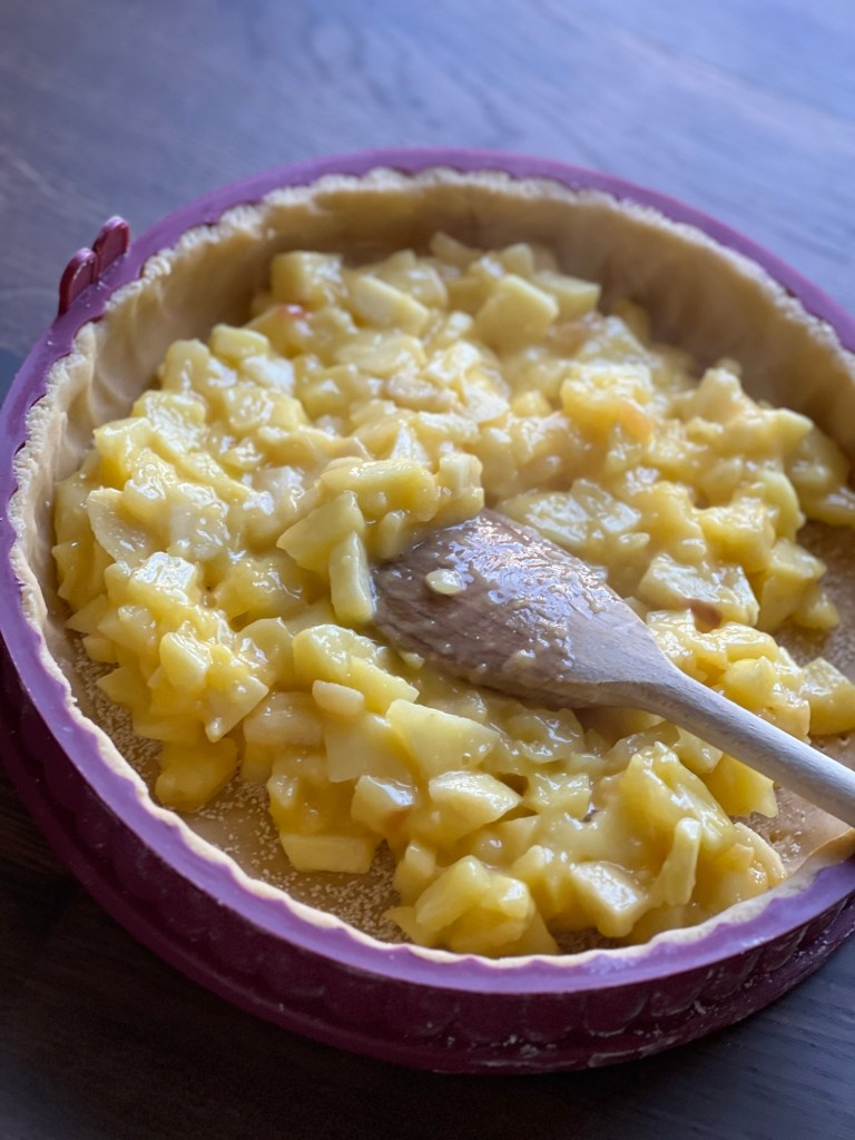 5 EL Apfelsaft mit dem Puddingpulver glattrühren. Den restlichen Apfelsaft mit 50 g Zucker zu den Äpfeln geben und in einem Topf 5 Min. dünsten, bis die Äpfel weich sind. Dann das angerührte Puddingpulver hinzugeben, aufkochen und unter Rühren 1 Min. köcheln lassen. Etwas abkühlen lassen.