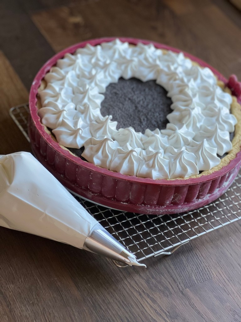 4 Eiweiße mit einer Prise Salz und 150 g Zucker steif schlagen. Kuchen aus dem Ofen nehmen und den Eischnee Gleichmäßigkeit einem Spritzbeutel darauf spritzen und bei gleicher Temperatur nochmal 25 Min. backen.