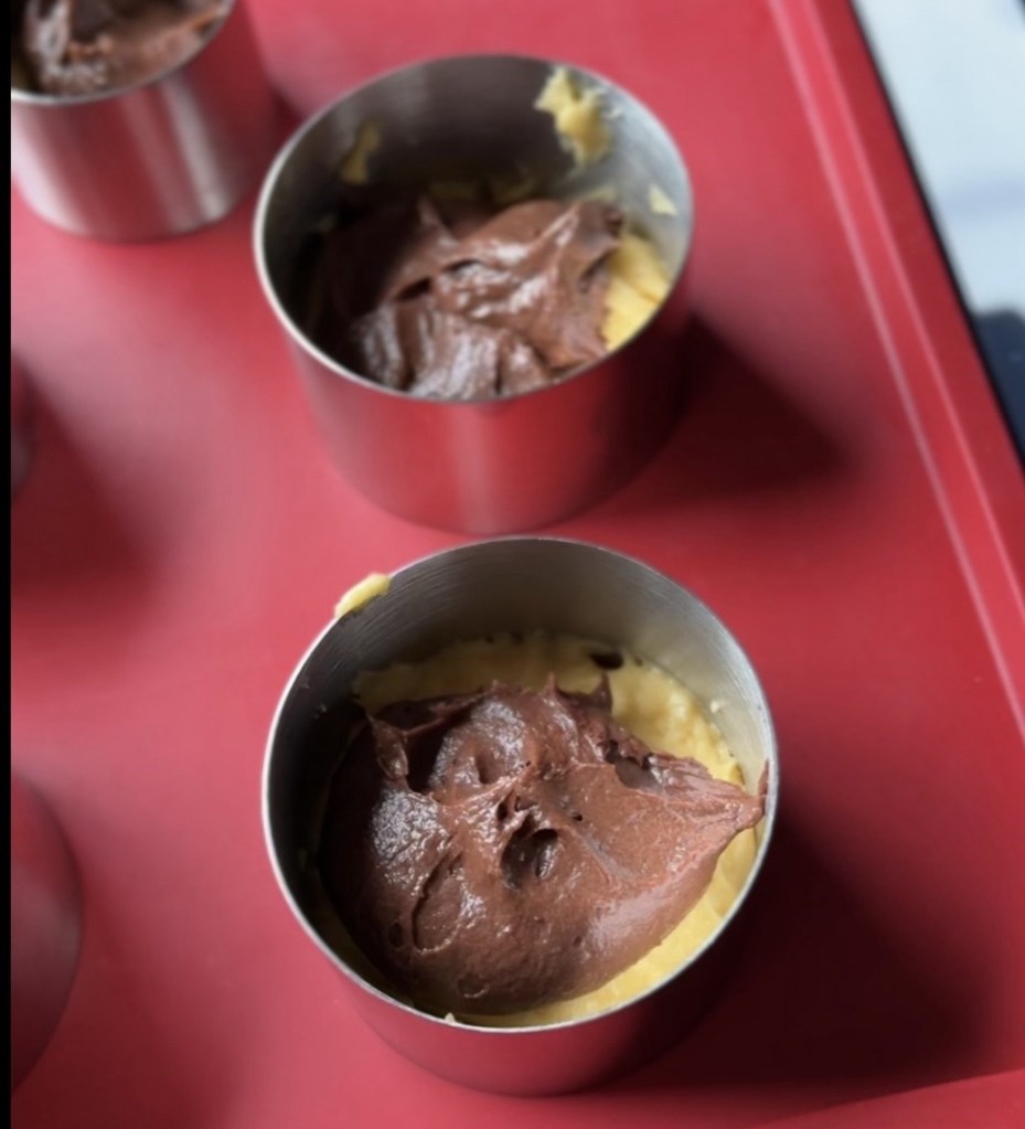 6 Dessertringe (8,5 cm) auf ein mit Backpapier belegtes Backblech stellen.