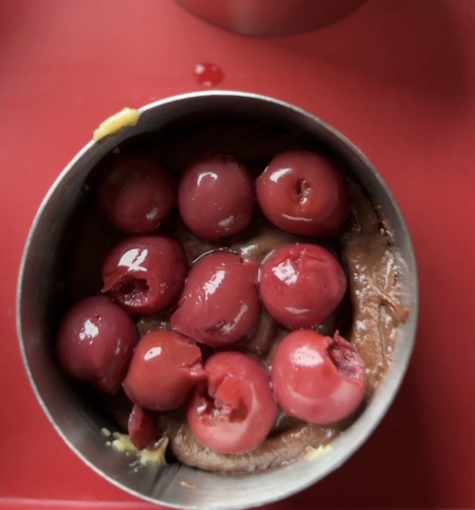 Die Kirschen in den Teig drücken.