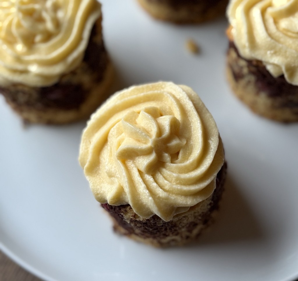 Buttercreme mi Hilfe eines Spritzbeutels auf die Törtchen spritzen.