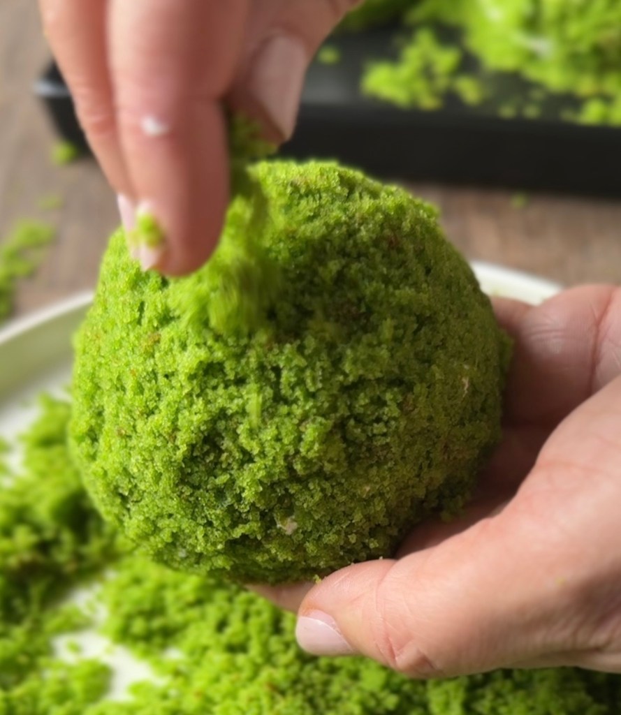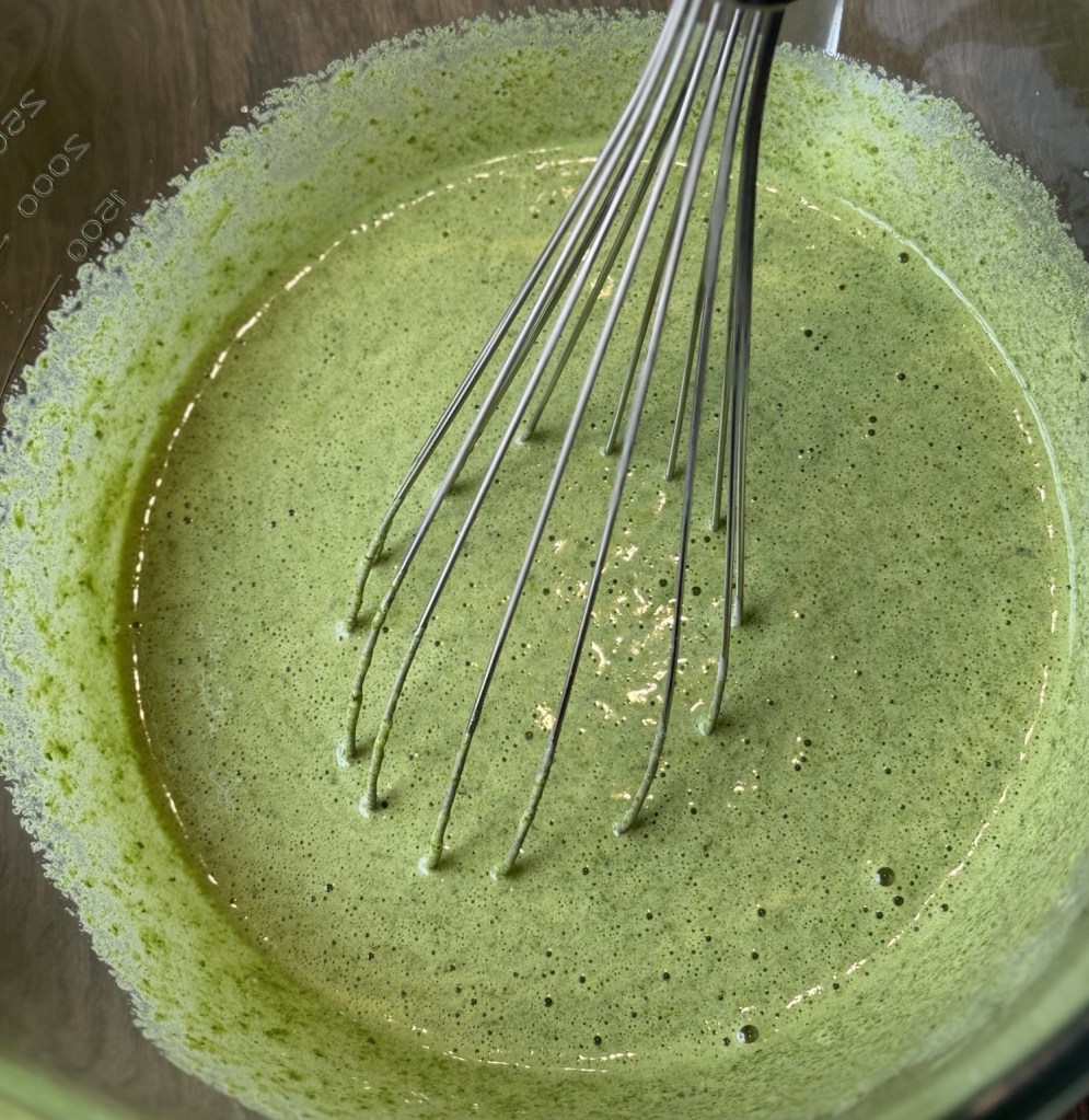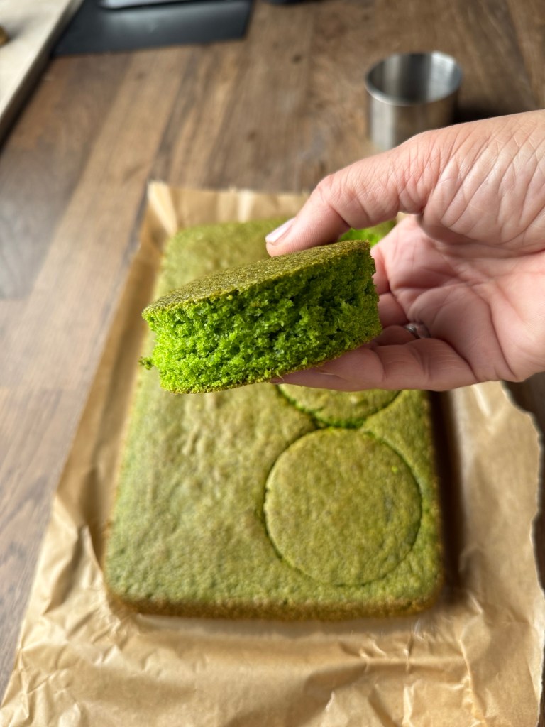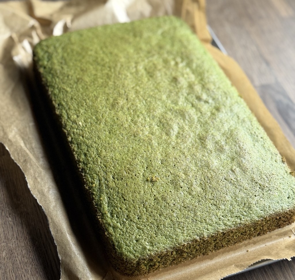 Für den Spinatbiskuitboden den Spinat mit dem Pürierstab pürieren. Den Zucker und die Eier schaumig rühren. Das Sonnenblumenöl langsam in die schaumige Masse rühren. Den Spinat unter die Eimasse heben.