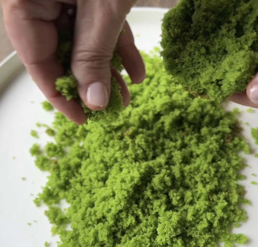 Etwa ein Zentimeter vom Tortenboden abschneiden und zusammen mit dem restlichen Tortenboden in Stücke zerkrümeln.