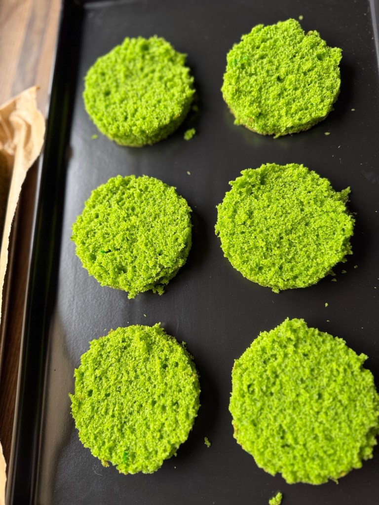 Aus dem ausgekühlten Tortenboden mit Servierringen 6 Törtchen ausstechen.