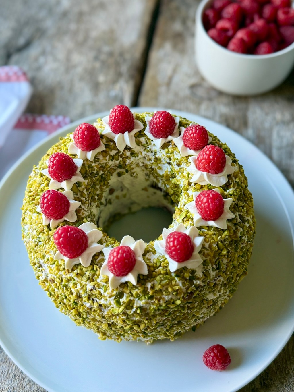 Pistazien auf dem Kranz verteilen, leicht andrücken. Mit Sahne und Himbeeren garnieren.